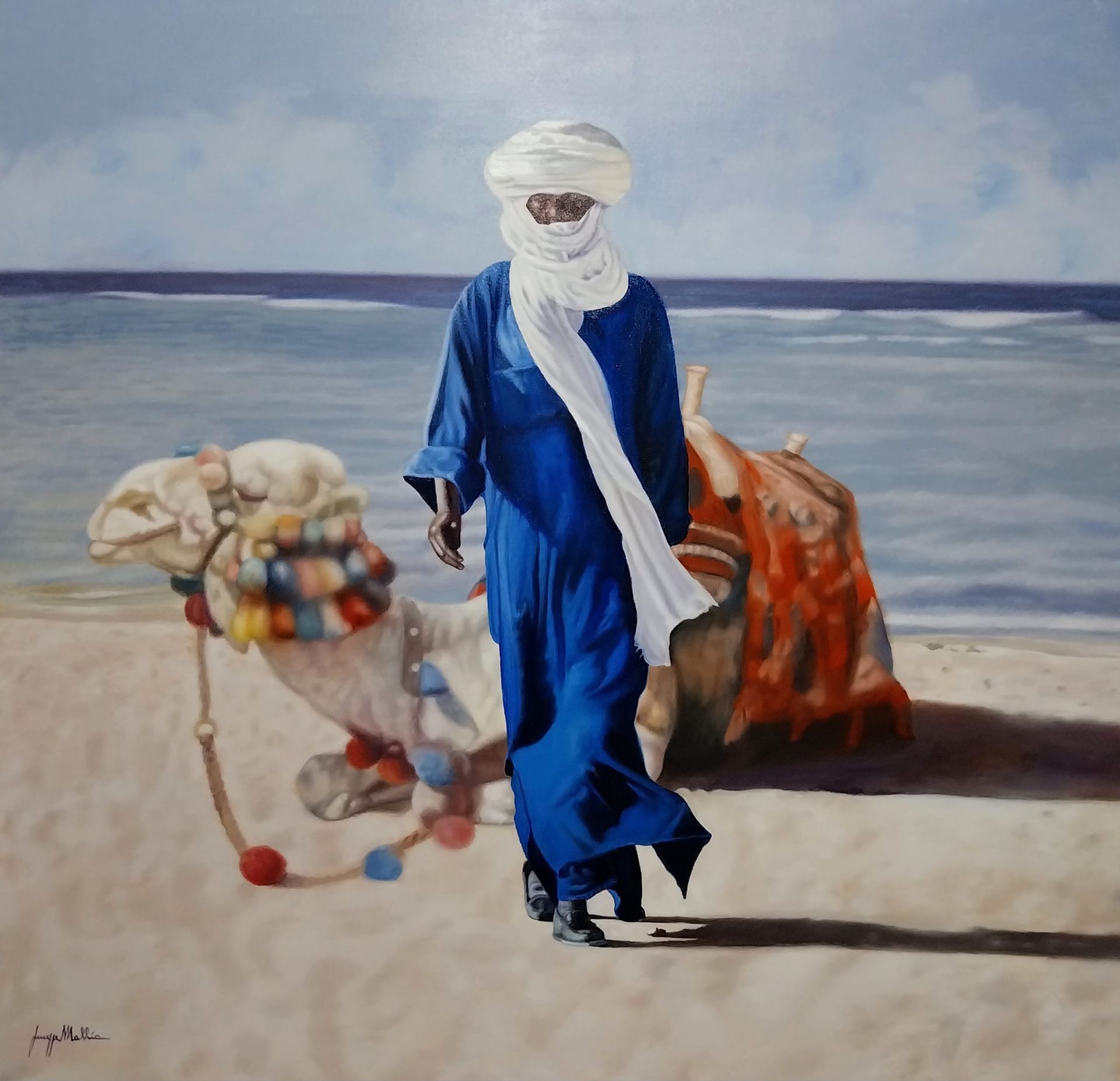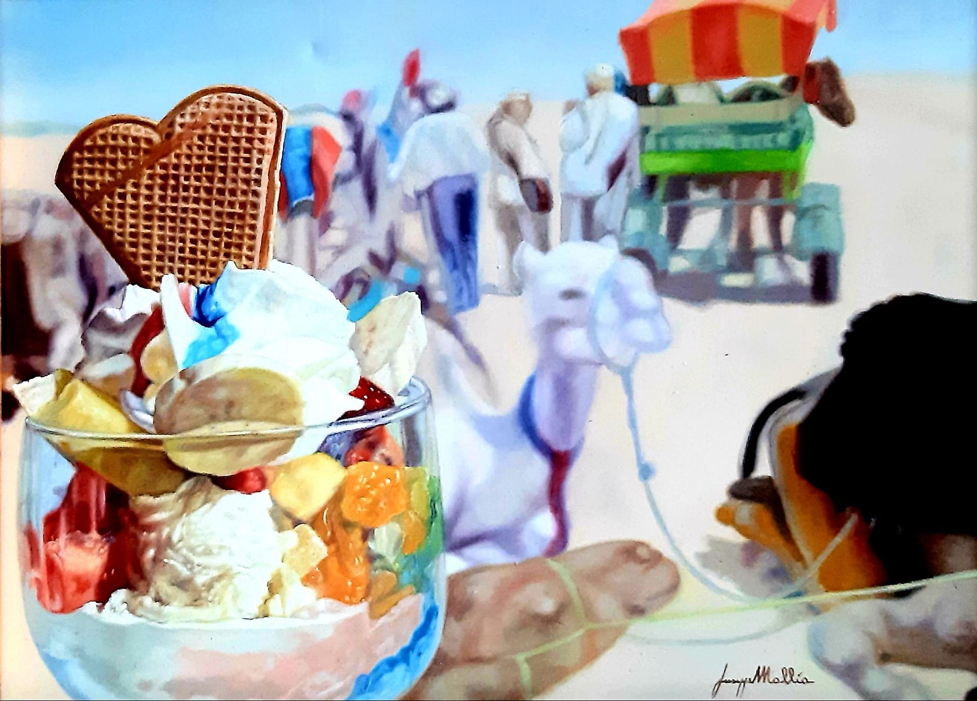Su un ripiano erano stati ordinatamente sistemati, probabilmente in attesa di essere esposti a breve, i quadri di Giuseppe Mallia. Immediatamente mi hanno colpito per un realismo sorprendente ed estremamente intrigante. Immersi nel deserto, a riposo o in cammino, si scorgono cammelli dipinti con uno stile preciso e inappuntabili, sia dal punto di vista coloristico - i quadri paiono dipinti “in punta di pennello”, specie in certi minuti dettagli chiaroscurali – che prospettico. Questi due elementi, estremamente congiunti, non si risolvono in una semplice resa calligrafica dei soggetti, ma anzi diventano i cardini attorno ai quali Giuseppe Mallia struttura delle visioni che assumono il fascino del sogno e il piacere dell’idillio. La sua è, dunque, una pittura estremamente accattivante, sincera nel profondo e dunque estremamente godibile, capace di unire saldamente visione e rappresentazione".