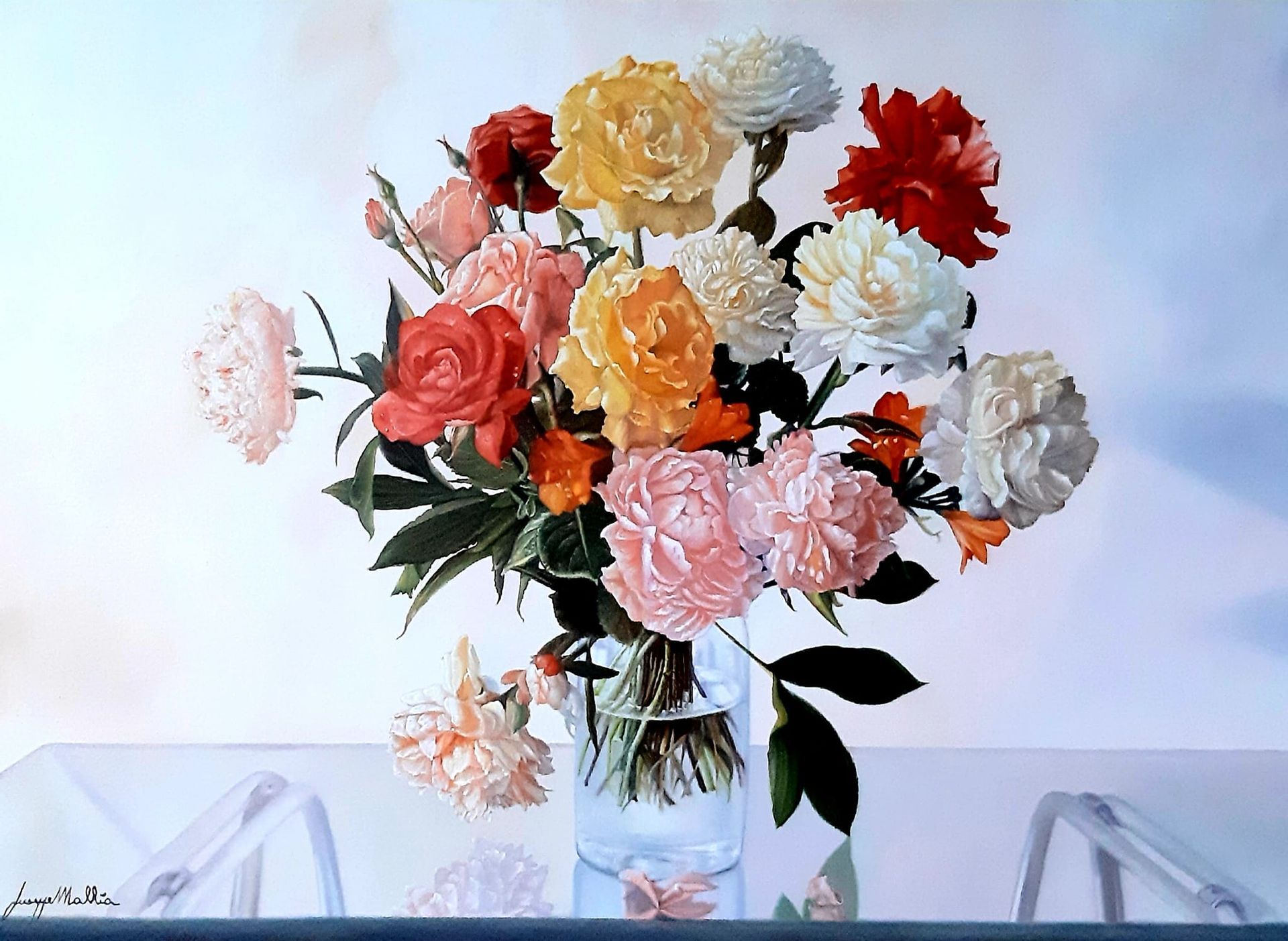 Giuseppe Mallia non ama seguire le avanguardie contemporanee, non cerca di stupire con ricerche estetiche audaci, non sperimenta nuove tecniche, non sceglie temi drammatici per comunicare le sue emozioni e si allontana da qualunque problematica. Il suo racconto si ispira al quotidiano disegnando oggetti, indumenti, composizioni floreali attraverso una estrema precisione del segno grafico. Mallia è un attento osservatore della realtà e il suo merito è quello di ridare alle cose il loro fascino segreto. Ogni cosa cela dietro di sé ricordi, impressioni, sentimenti, sensazioni che non possono essere cancellate. L’autore concepisce il dipinto come una immagine comunicativa e predilige indirizzarsi verso un linguaggio figurativo. Egli si dedica anche al tema della natura e sa cogliere lo splendore di una rosa sbocciata. Ciò che colpisce è la sincerità con cui Mallia stabilisce un rapporto con la natura. I suoi fiori diventano il pretesto per esprimere il suo amore per il creato. Le immagini sono sostenute da un vibrante gioco coloristico e sono immerse in una atmosfera incantata sospesa in un tempo senza fine. Nulla è affidato al caso, tutto è immobile. Il bisogno di dipingere di Mallia sorge dalla necessità di trasmettere allo spettatore le vibrazioni raccolte dal mondo che lo circonda. Le composizioni sono caratterizzate da pennellate sicure e da una abilità di riprodurre la realtà indiscutibile. E’ chiara in queste opere la ricerca della forma oltre ad una interessante impostazione dinamica della scena. Il pittore entra in contatto con ciò che descrive senza lasciarsi sfuggire nulla di quanto contraddistingue il soggetto, senza sottostare alla rigidità fotografica, ma facendo emergere l’attimo fuggente di un istante che non si ripeterà.